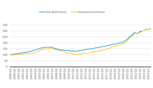 From Q1 2000 to Q2 2025, real property manufactured homes and site-built homes appreciated at nearly the same rate, increasing 219.1 percent for manufactured homes and 219.9 percent for site-built homes. And in the past decade, manufactured homes have seen higher year-over-year increases than site-built homes in nearly every quarter.